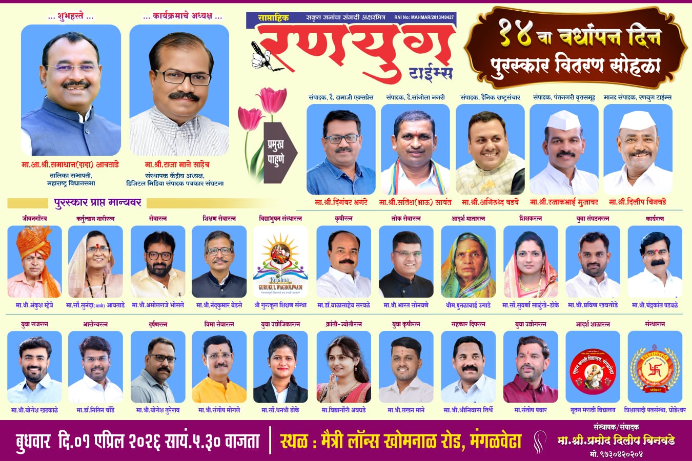 पत्रकारितेच्या माध्यमातून समाजातील विविध प्रश्नांना वाचा फोडत गेल्या १४ वर्षांपासून साप्ताहिक रणयुग टाईम्स सातत्याने कार्यरत आहे. या वर्धापन दिन सोहळ्यास पत्रकार, सामाजिक कार्यकर्ते, विविध क्षेत्रातील मान्यवर तसेच नागरिकांनी मोठ्या संख्येने उपस्थित राहावे, असे आवाहन संयोजक संपादक प्रमोद दिलीप बिनवडे यांनी केले आहे.