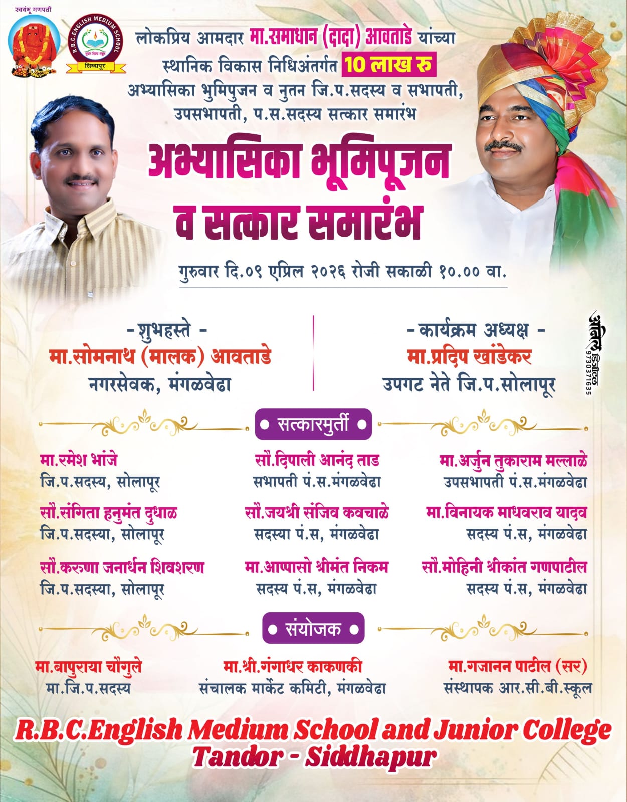 आमदार समाधान आवताडे यांच्या स्थानिक विकास निधीअंतर्गत मंजूर झालेल्या १० लाख रुपयांच्या भव्य अभ्यासिकेचे भूमिपूजन आणि नूतन जिल्हा परिषद व पंचायत समिती सदस्यांचा सत्कार समारंभ आज, गुरुवार दि. ९ एप्रिल २०२६ रोजी सकाळी १० वाजता आयोजित करण्यात आला असल्याची माहिती गजानन पाटील सर यांनी दिली आहे.