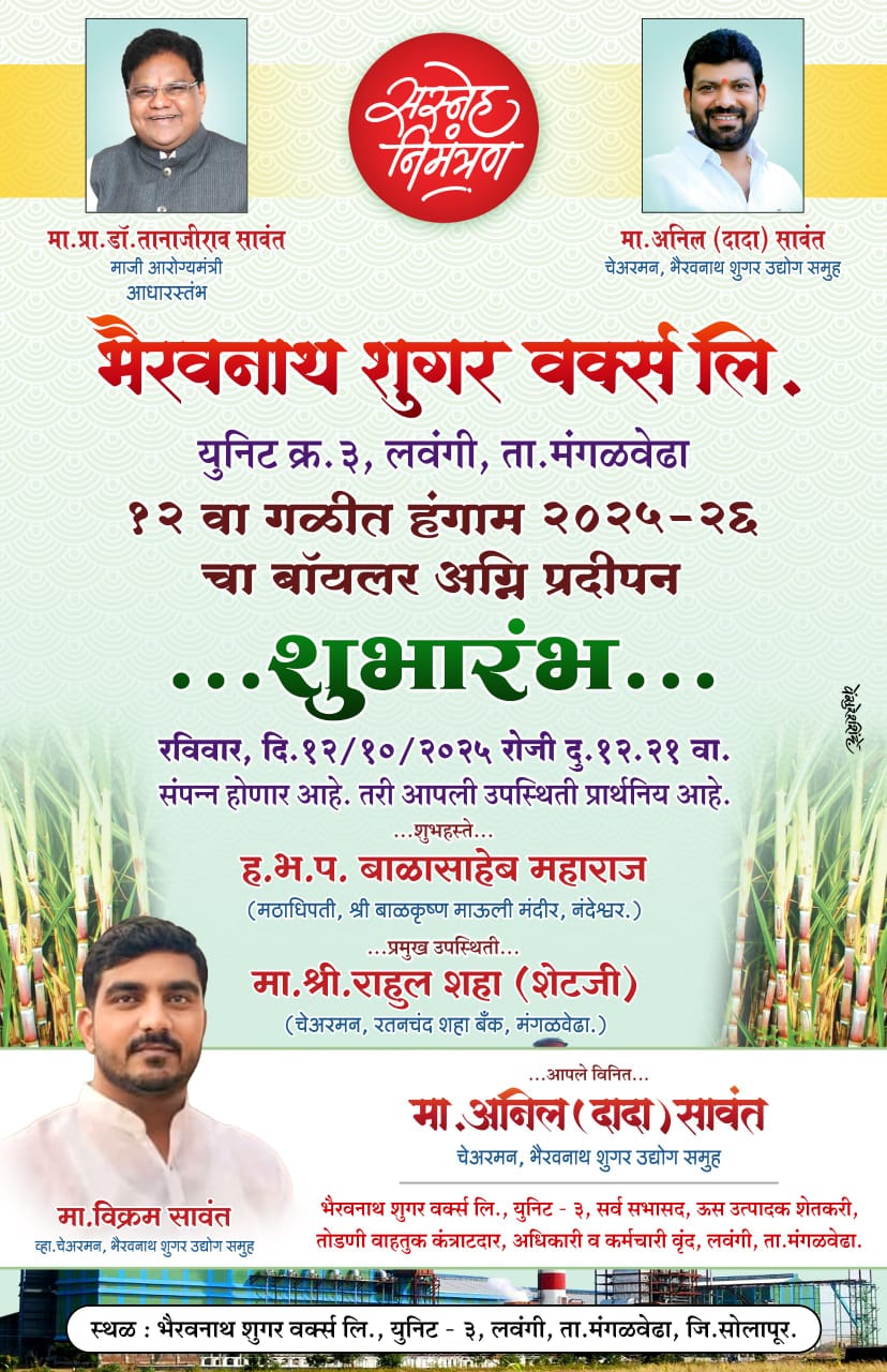 भैरवनाथ शुगरचा १२ वा गळीत हंगामचा बॉयलर अग्नी प्रदीपन शुभारंभ उत्साहात; कारखान्याचे ६ लाख मे.टन गाळपाचे उदिष्ट पूर्ण करू; चेअरमन अनिल सावंत यांनी दिले शेतकऱ्यांना आश्वासन