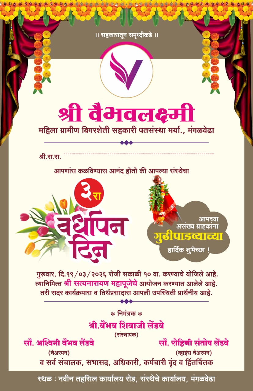 मंगळवेढा शहरातील शिशु विहारसमोरील श्री वैभवलक्ष्मी महिला ग्रामीण बिगरशेती सह.पतसंस्थेचा तिसऱ्या वर्धापनदिन आज मोठ्या उत्साहात साजरा करण्यात येणार आहे.