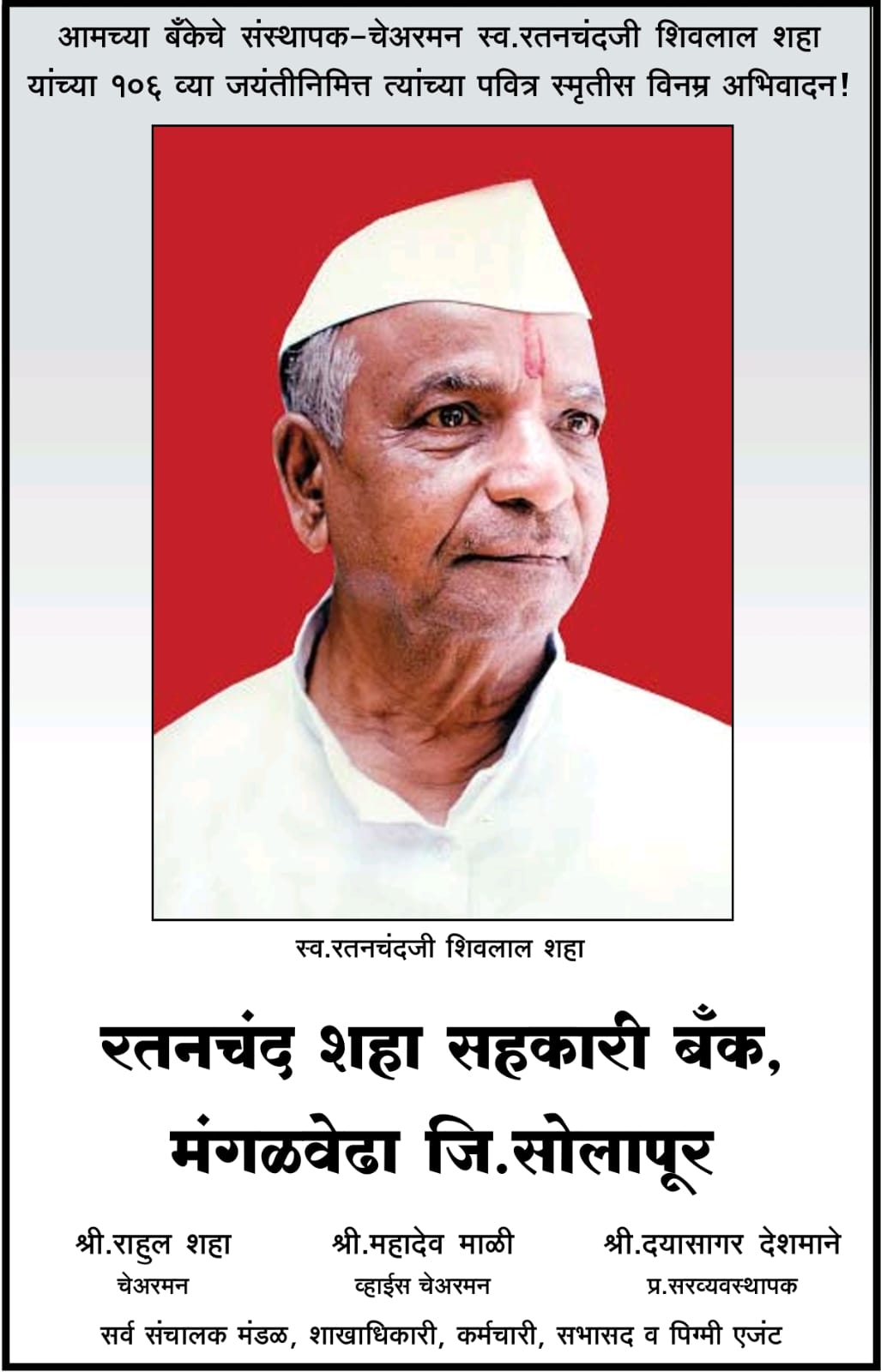 स्व. रतनचंद शिवलाल शहा यांची १०६ वी जयंती आज बुधवार दि. ४ फेब्रुवारी २०२६ रोजी असून त्यानिमित्त सकाळी १० वा. श्री संत दामाजी महाविद्यालय येथे प्रतिमेचे पूजन करण्यात येणार आहे.