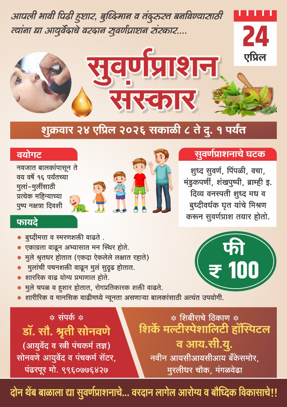 मंगळवेढा शहरात नवजात बालकांपासून ते 16 वर्षाच्या मुलां-मुलींसाठी उद्या शनिवार दि.28 मार्च रोजी नवीन ICICI बँकेसमोर “शिर्के मल्टीस्पेशालिटी हॉस्पिटलमध्ये” सकाळी 8 ते 1 वाजेपर्यंत सुवर्ण प्राशनसंस्कार शिबीर आयोजित करण्यात आल्याची माहिती डॉ.श्रुती सोनवणे यांनी दिली आहे.
