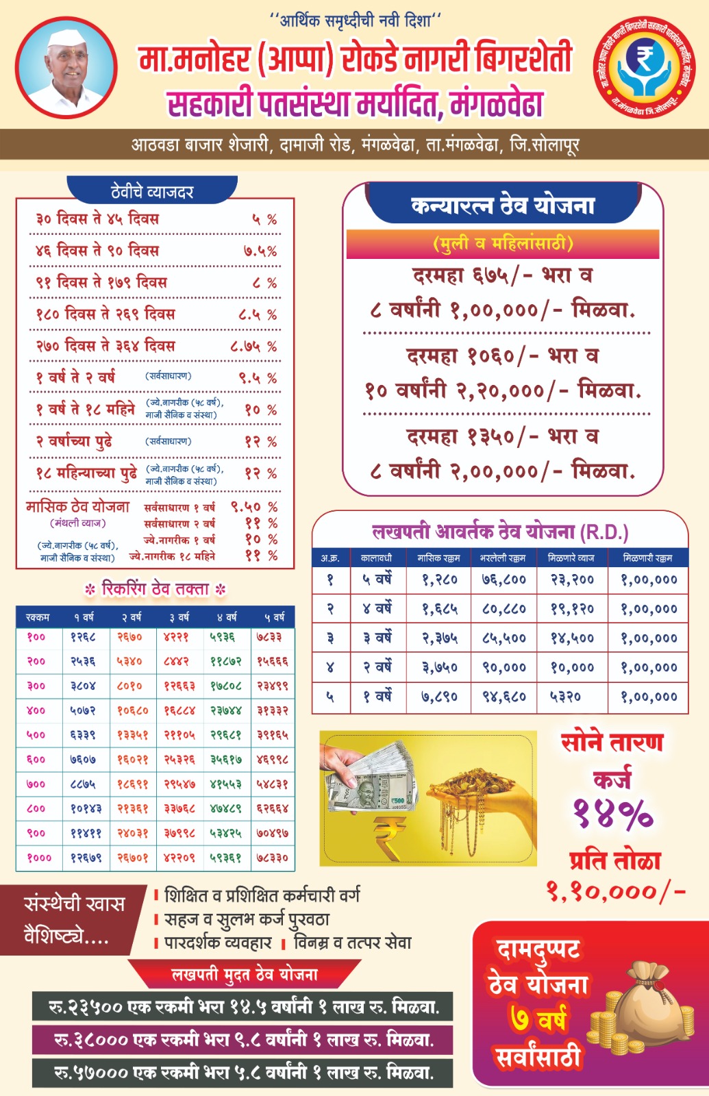 तसेच मनोहर(आप्पा)रोकडे नागरी बिगरशेती सहकारी पतसंस्थेने कन्यारत्न ठेव योजना, लखपती आवर्तक ठेव योजना, लखपती मुदतठेव योजना व ठेवींवर आकर्षक व्याजदर दिले जाणार आहे.